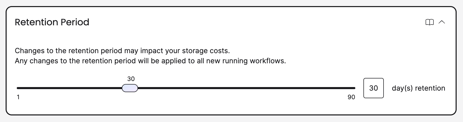 Temporal Cloud sets the default Retention Period to 30 days. This is configurable in the Temporal Web UI.
